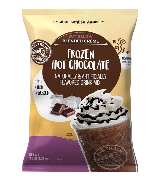 Put a spin on your traditional hot chocolate beverages, and offer this Big Train 20 Below frozen hot chocolate mix! This specialty drink mix features the decadent taste of rich cocoa in a creamy blended mix perfect for creating popular, unique chocolate drinks! It offers all the flavor of hot chocolate beverages blended up into a cool, refreshing, and sweet drink that’s sure to become a new customer favorite. In addition to its mouthwatering taste, it’s also trans fat free, and contains no hydrogenated oil.