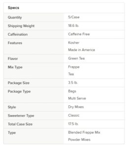 This mix is perfect for sprucing up the menu in your coffee shop or cafe in order to offer profitable, creamy, decadent drinks. Better yet, these drinks are easier than ever to make. Just add water or milk for gourmet green tea taste. This blended creme frappe mix adds alluring flavor to your signature drinks, while satisfying your patrons’ cravings for something sweet and new!