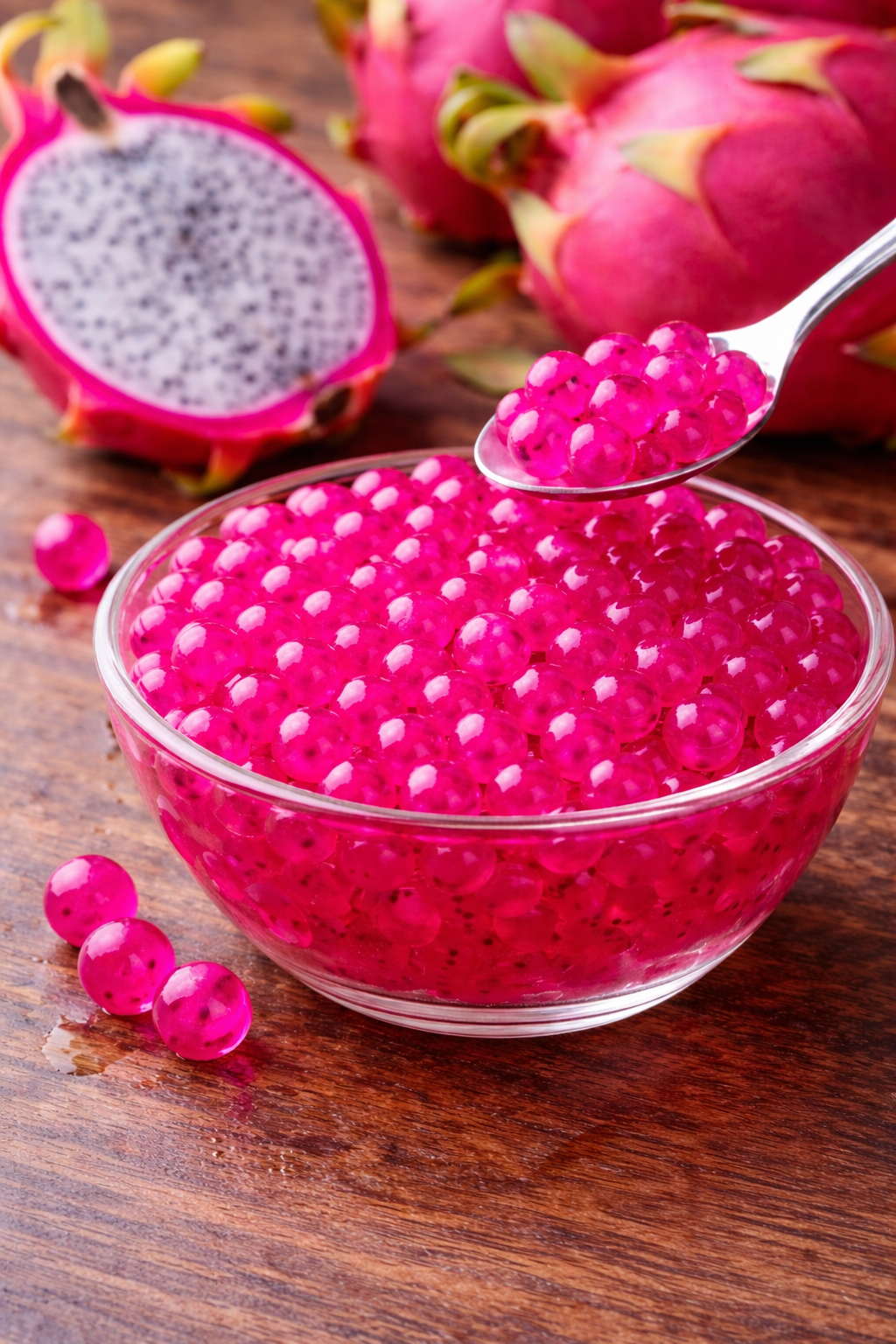 Add a vibrant tropical touch to your drinks with our Dragon Fruit Popping Boba Pearls. These bright magenta pearls are filled with sweet dragon fruit flavor that burst in your mouth with every bite.