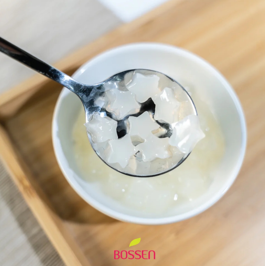 Bursting with sweet, exotic lychee flavor, Bossen Lychee Star Jelly is made of nata de coco (natural coconut gel) and consists of translucent, soft, jelly-like morsels that are sweetened with syrup.