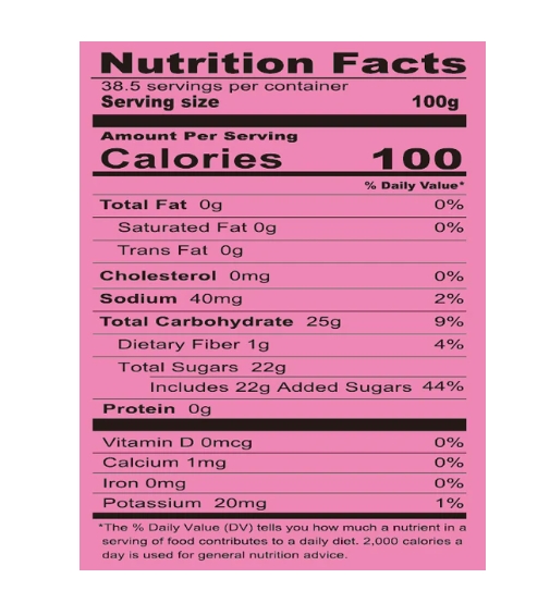 Ingredients : NATA DE COCO PULP, HIGH FRUCTOSE SYRUP, WATER, SUGAR, DL-MALIC ACID (E296), STRAWBERRY FLAVOR, POTASSIUM SORBATE AS PRESERVATIVE (E202), XANTHAN GUM (E415), SODIUM CITRATE (E331), CALCIUM LACTATE (E327), FD&C RED #40 (E129), ANTIFOAM (WATER, SILICON RESIN,