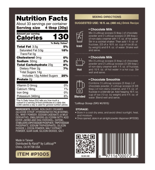 Ingredients: Sugar, Creamer, Cocoa Powder, Malt Extract Powder, Gum, Anti-Caking Agent, Salt