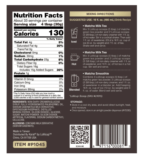 Ingredients: Non-Dairy Creamer (Glucose Syrup, Refined Hydrogenated Palm Kernel Oil and/or Refined Fully Hydrogenated Coconut Oil, Casein Sodium, Dipotassium Phosphate, Sodium Hexametaphosphate, Mono and Diglycerides of Fatty Acids, Mono and Diacetyltartaric Acid Esters of Mono-and Diglycerides of Fatty Acids, Silicon Dioxide, Carotenes), Sugar, Glucose, Matcha Powder